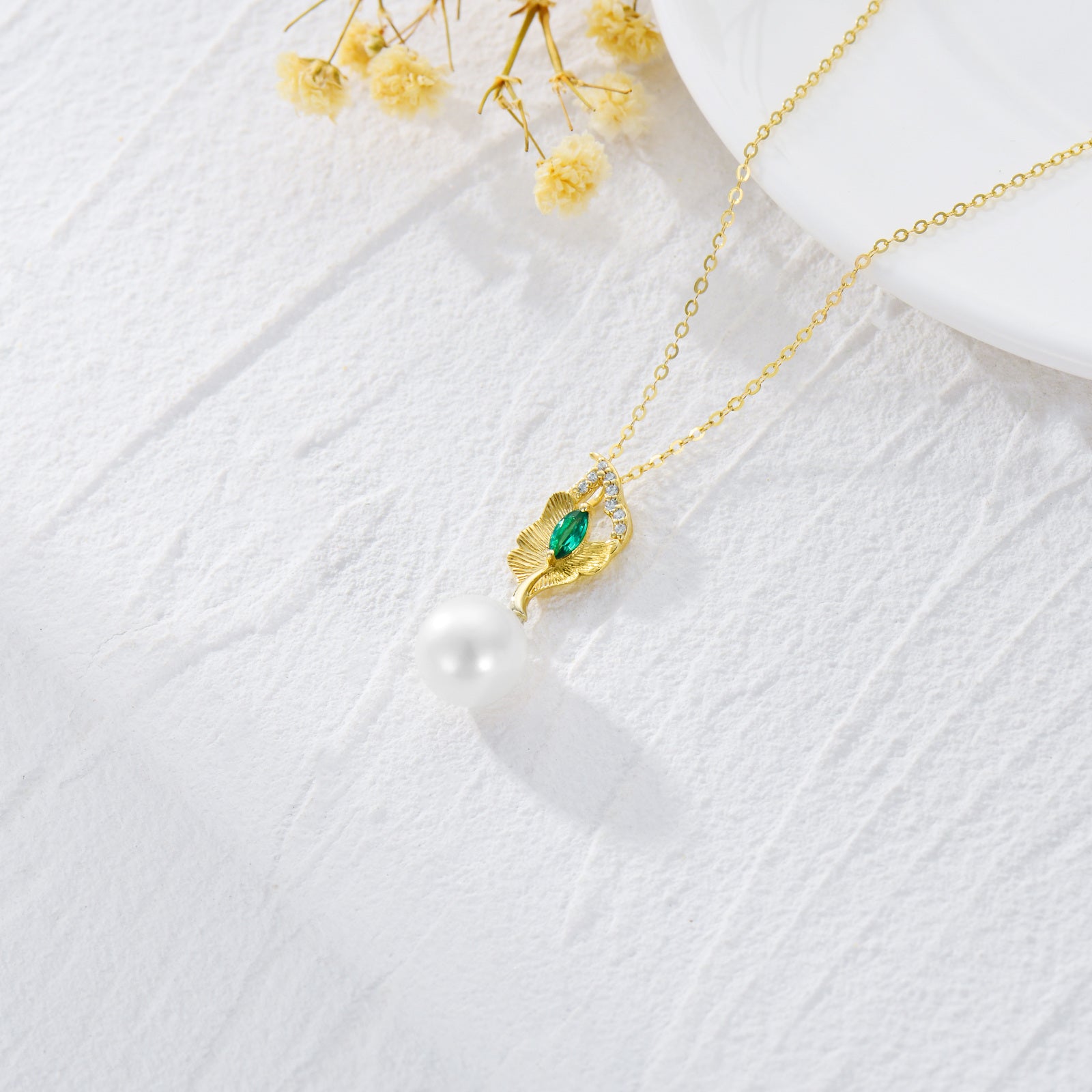 9K Solid Yellow Gold Emerald Leaf Pendant Necklace with 9mm Pearl