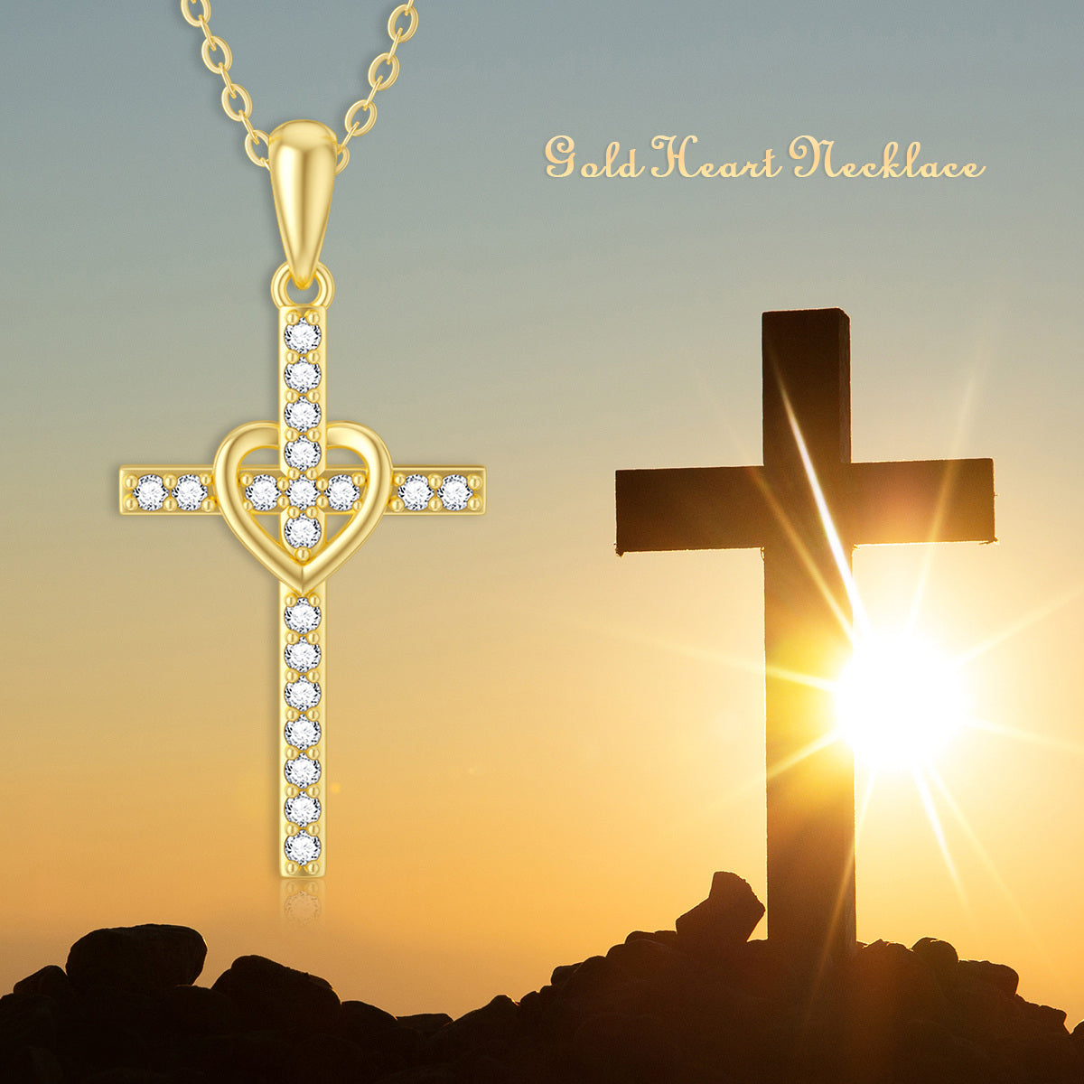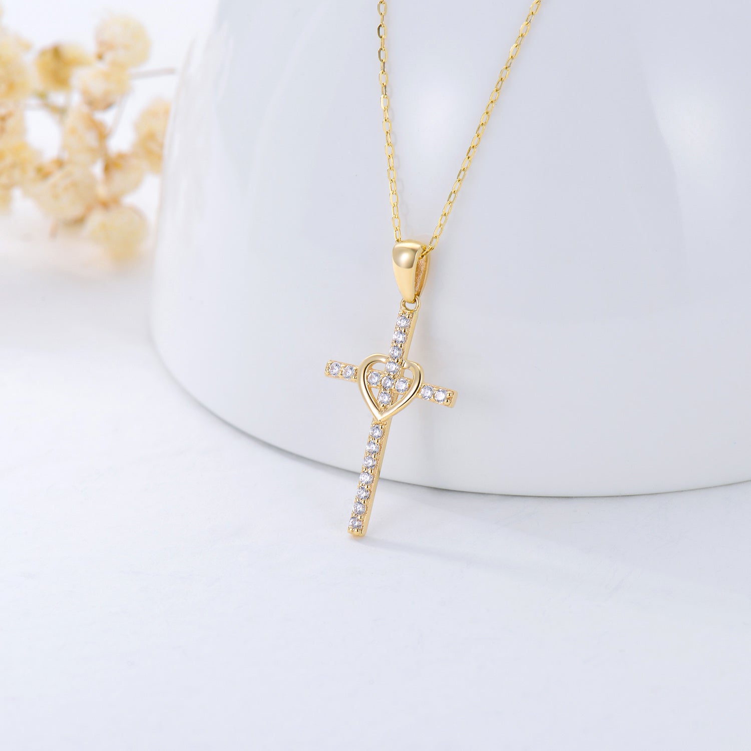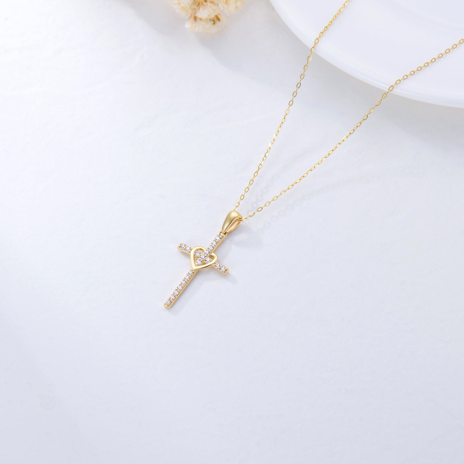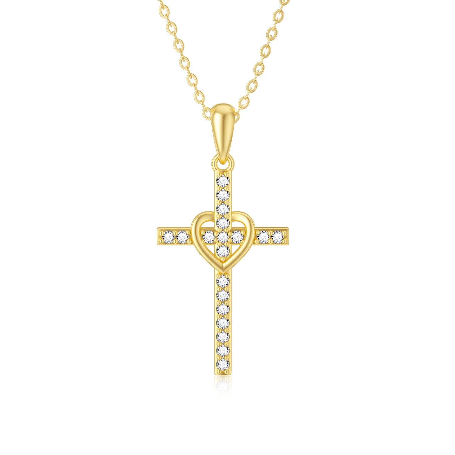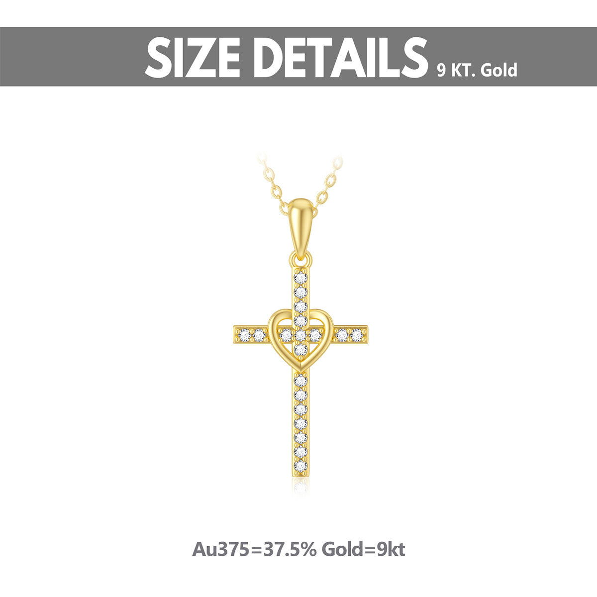 9K Solid Yellow Gold Heart & Cross Pendant Necklace with Cubic Zirconia